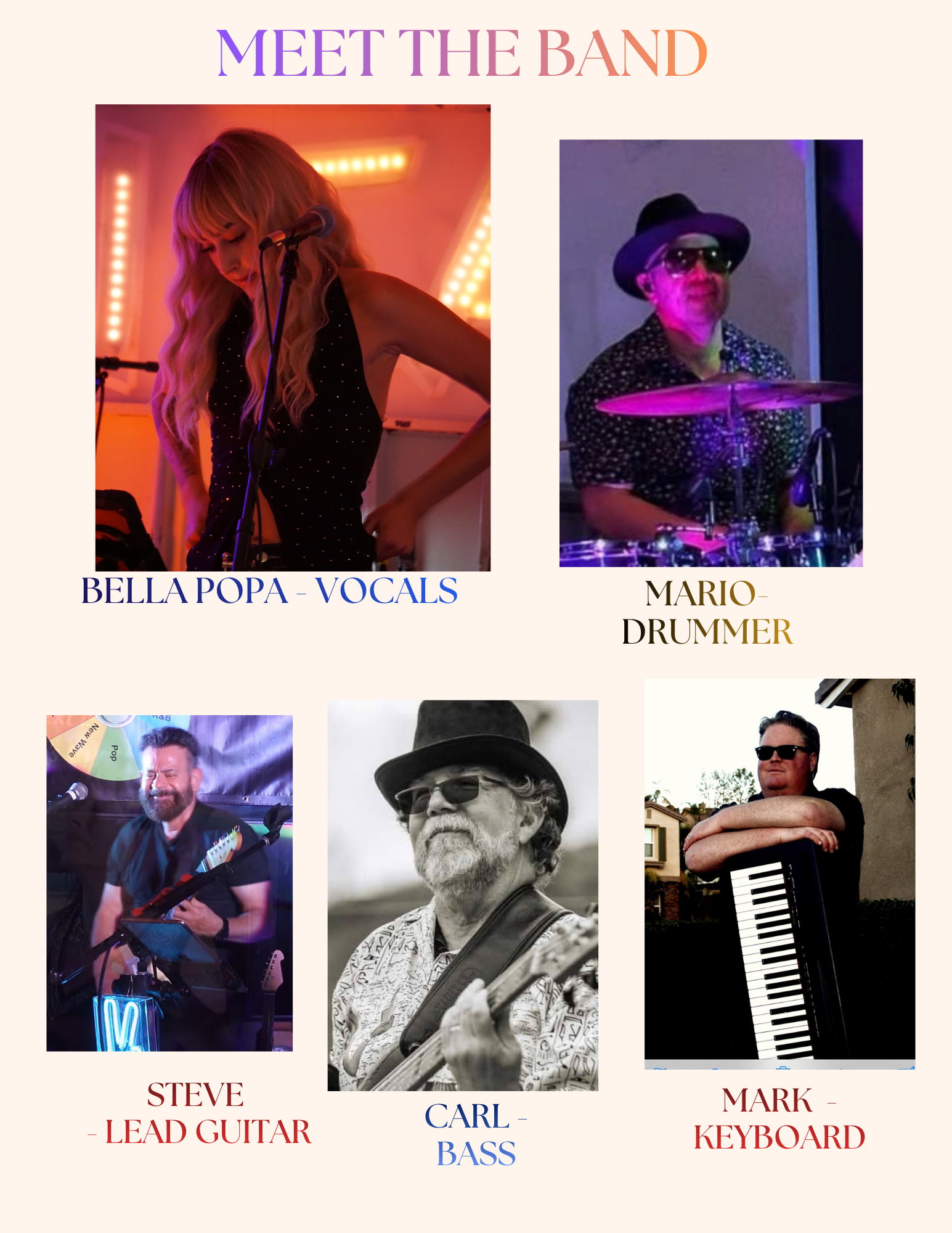 Bella Popa Band is a high-energy Southern California live band led by dynamic vocalist, guitarist, and songwriter Bella Popa. Known for commanding stages across Temecula Valley and beyond, the band delivers a crowd-pleasing mix of rock, country, pop, and dance favorites that keep audiences singing and dancing all night.